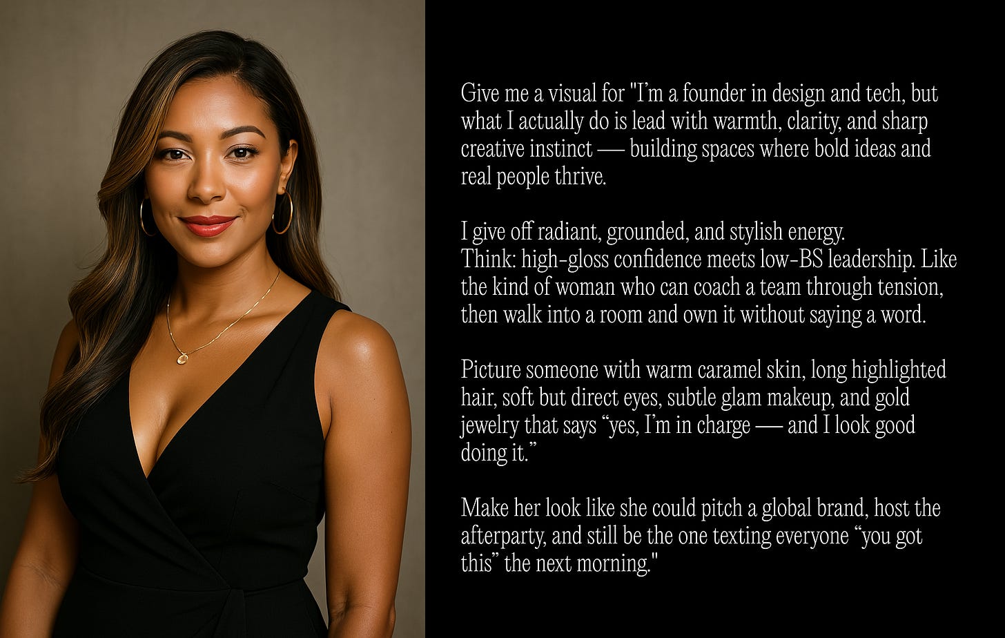 3. Physical details (optional, but helpful): "Picture someone with [describe visible attributes — e.g., warm skin tone, highlighted hair, hoop earrings, confident posture, glowing smile, sharp eyes].”