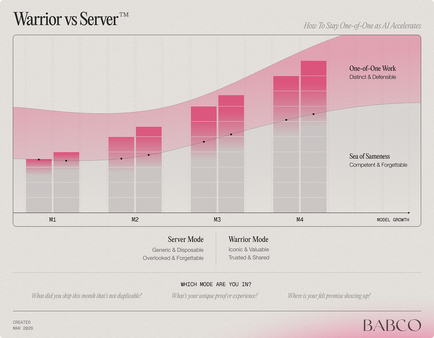 Let’s call the work the model can learn and repeat easily server mode. It’s fast, efficient, and replicable. AI will be incredible at server mode, which is why server-mode work gets duplicated. If you want to win, to be a first mover, to build something iconic, you need warrior mode. Server completes the job. Warrior wins the category by being distinct, defensible, and remembered.